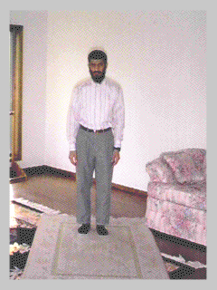 Once you finish reciting raise your hands up to the ears, saying "Allahu Akbar." Bow (your hands on your knees, back straight, your face toward the ground, saying three times, "Subhana rabbiyal adheem" (Glory be to my Lord Almighty). This position is called (ruku'). See photo.
